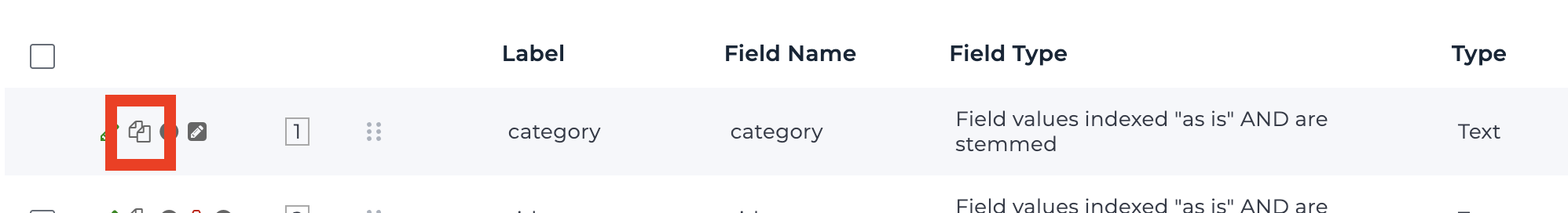 You can do this by logging into the HawkSearch account and navigating to Workbench -> Data Management -> Fields. From here, locate your exsisting Category field and then click on the icon indicated in the screenshot below. This will create a copy of the field for “category.”