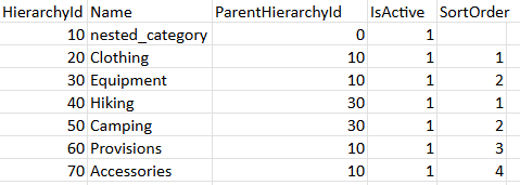 With this data structure we know that Hiking is a child of Equipment because the ParentHierachyId value for Hiking is set to 30, which is the HierachyId for the Equipment category. A full break down of the field names and their use is below.