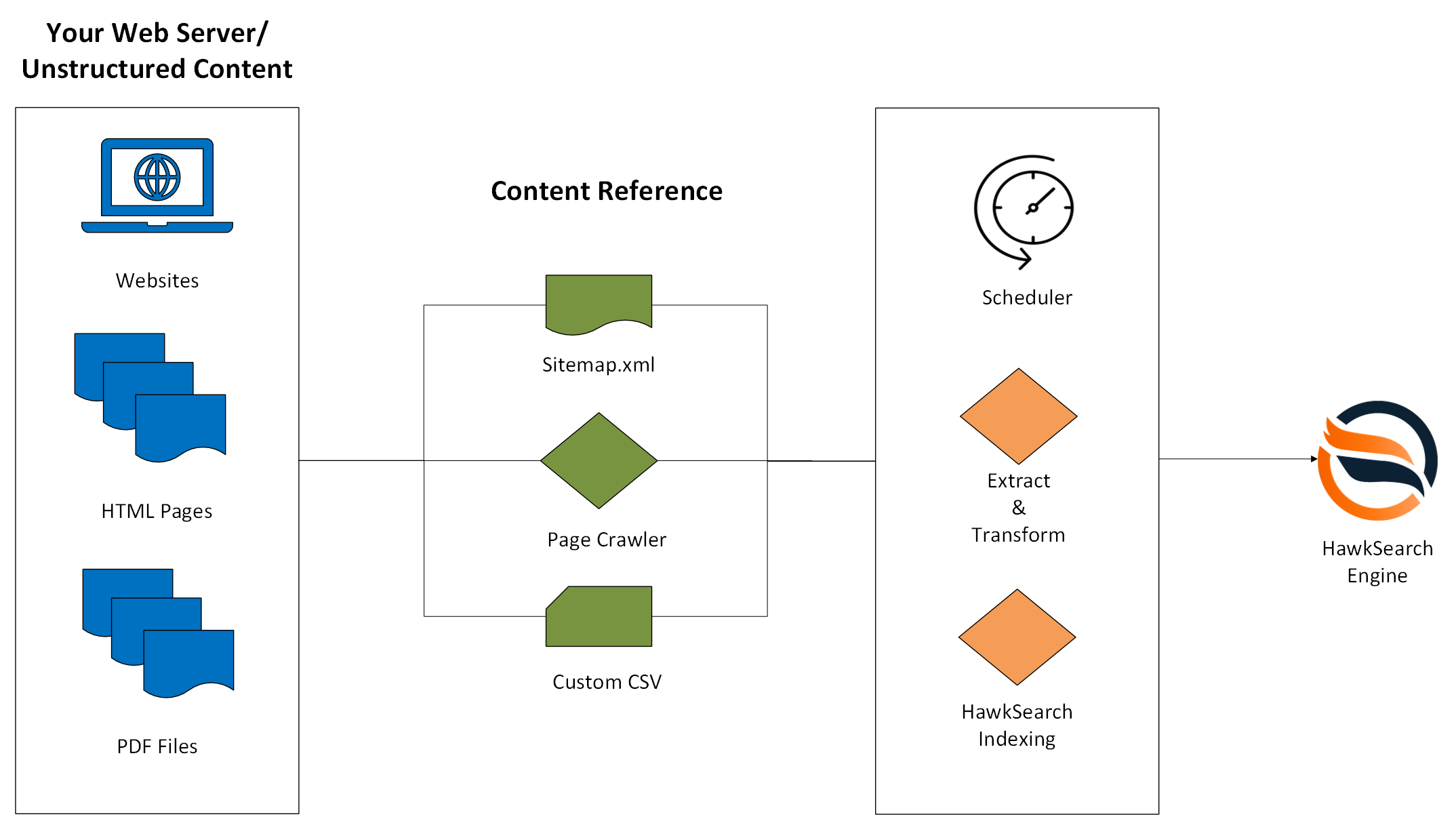 Since the unstructured content can be accessed through an online process, there are three ways that HawkSearch can know where those files are and scrape their contents.