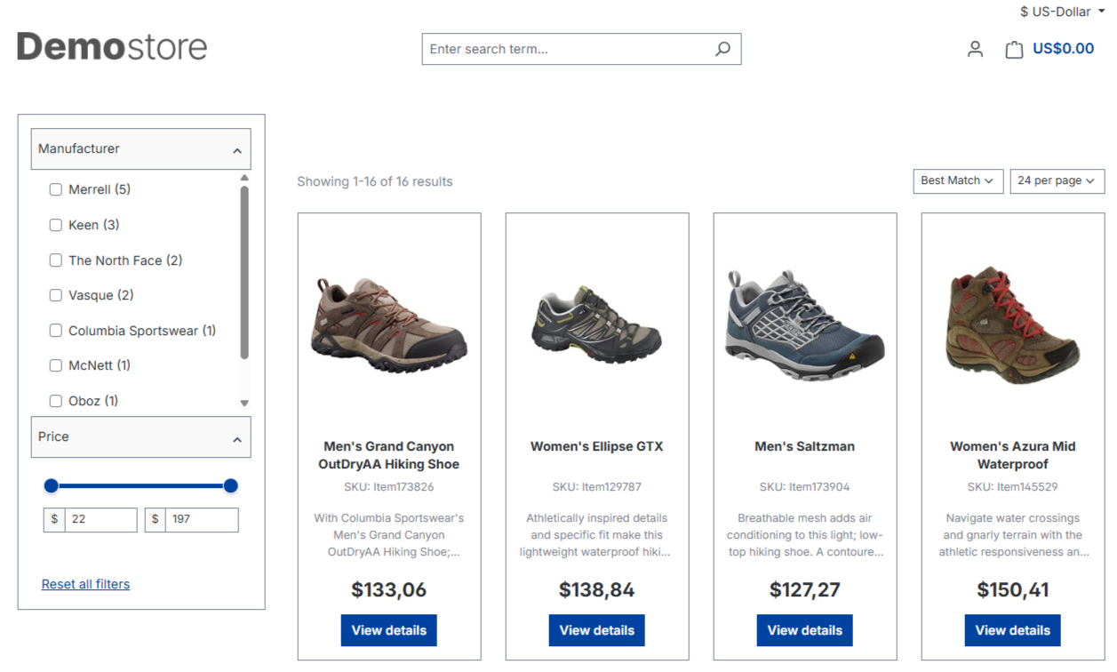 The Shopware Connector for HawkSearch takes care of many of the initial setup features as described above, but there is one basic setting that must be done in HawkSearch - Facets. Facets, also referred to as "Filters" are the options on the left of the search experience to help visitors drill down on specific attributes related to your product catalog. In this case the Facets are "Manufacturer" and "Price."