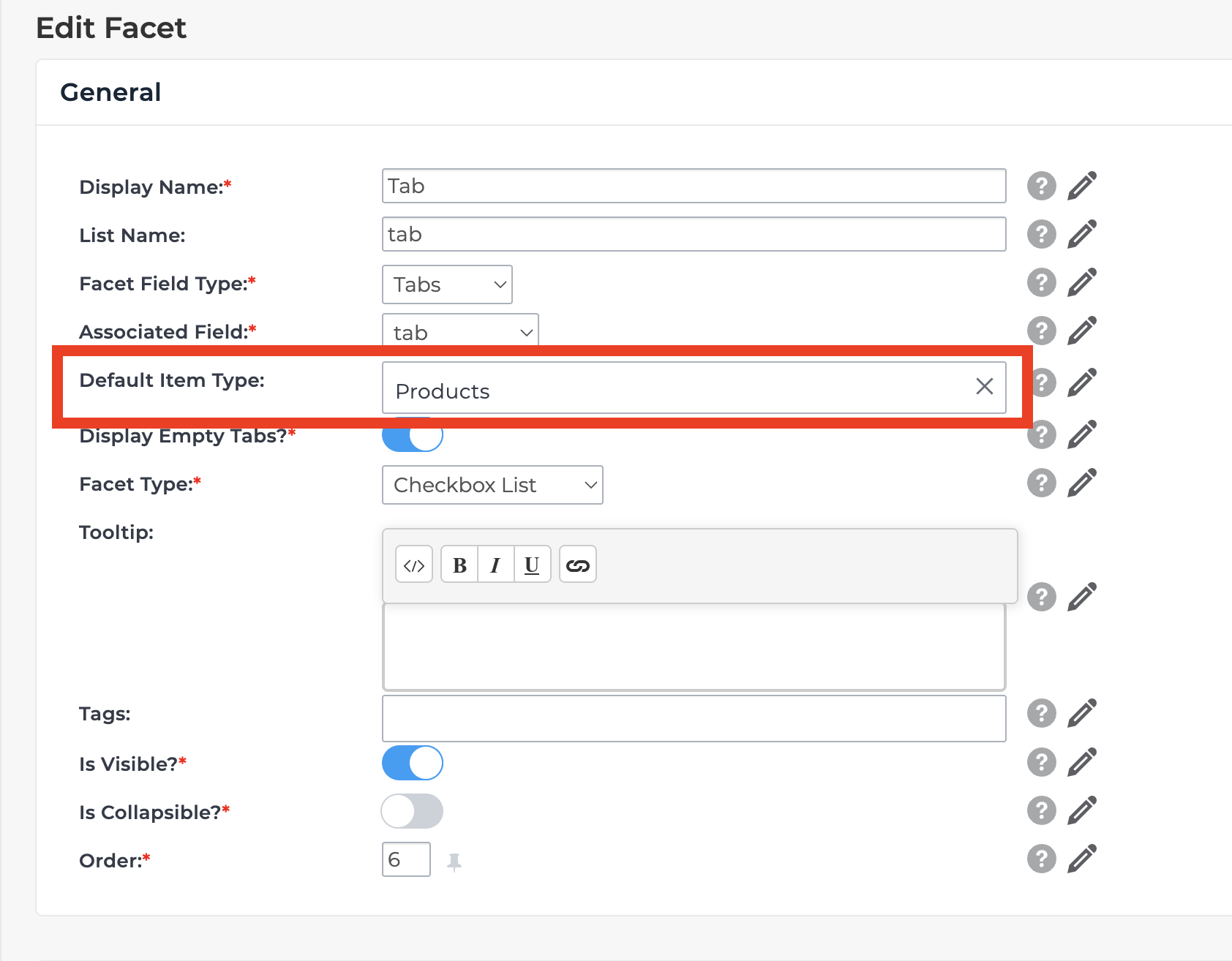 Once the data has been indexed in the step above, HawkSearch will now know what tabs are available to be used. With this data in place, you can define which tab should be the default one used when returning results. Return to the Facet Admin screen for the Tab facet as discussed in Step 1, and define the default tab. For our example, we will be using 'Products'.