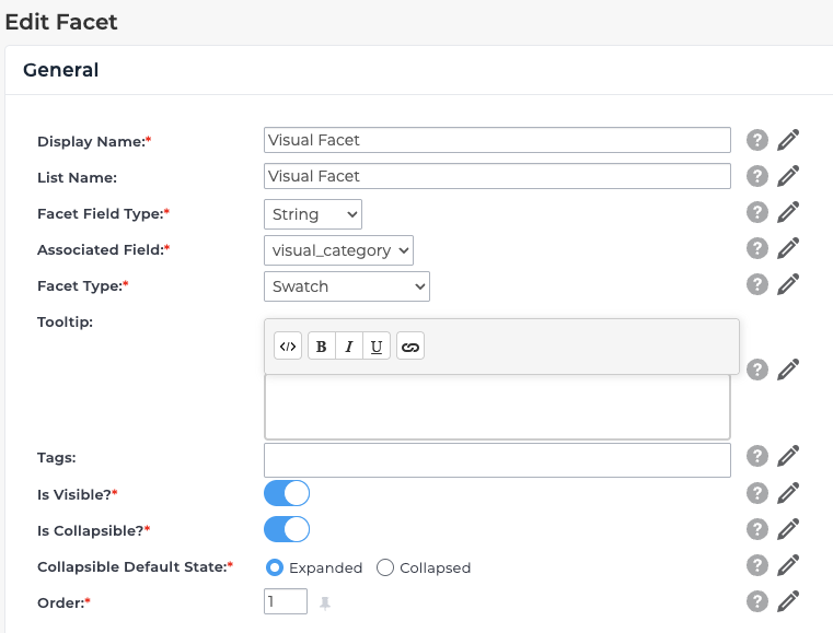 | Is default | One of visual facets must be set to "Is default" - it does not impact the initial results. |