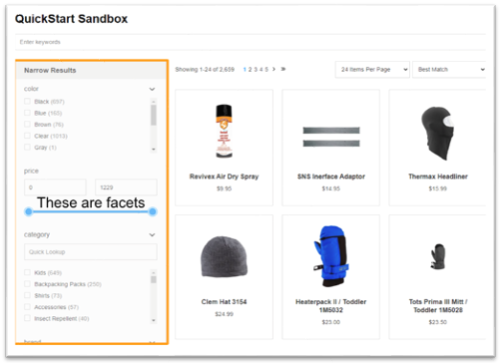 Facets, also referred to as filters, are a very common and practical way to provide options for drilling down on a specific category, manufacturer or dimension of a product set. These facets are typically provided within the left hand navigation of the search results.