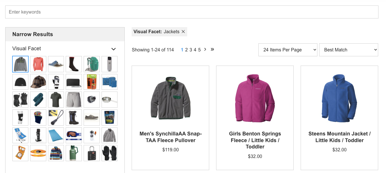 It's often helpful though to provide a facet navigation before getting to all of the products, especially if there are many products or facet options. It's also helpful to provide an image along with the facets for visibility. This visual facet approach can reside within the facet structure on the left:
